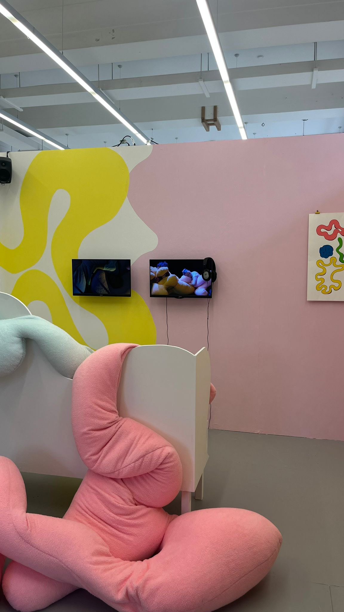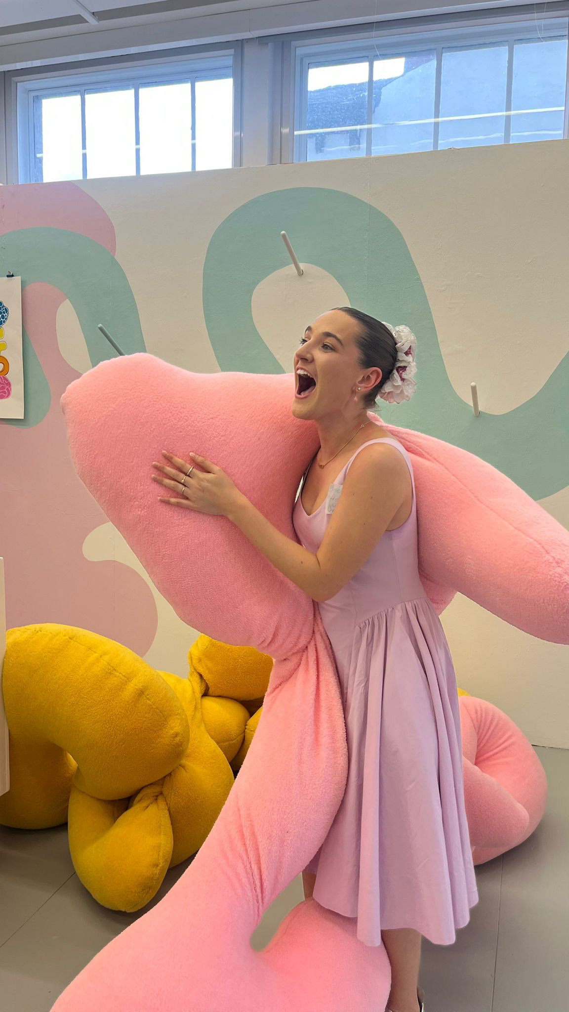 For my degree show, I created a sensory play environment using sculpture, video, sound, and print. The space was designed to encourage touch, curiosity, and interaction — inviting visitors to squish, squeeze, and explore my tactile, toy-like sculptures. To introduce playful attitudes,  I use soft materials like teddy fleece and recycled fillings to evoke comfort and childhood. Alongside the sculptures, the video and sound gently guided the audience into playful engagement, while prints echoed the colours and abstract forms of the sculptural pieces. Through this work, I aimed to create a space where play is not only allowed but celebrated — offering a break from Art School formalities and reconnecting us with the pleasures of being curious, silly, and hands-on.